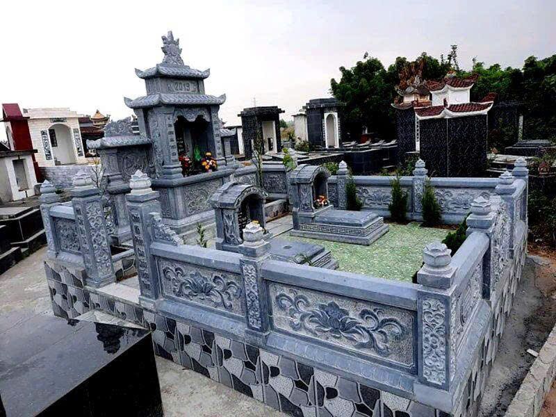 Sắc xám đen trầm giúp khu lăng mộ thể hiện rõ sự trang nghiêm, bền vững và trật tự của không gian tưởng niệm. Đây là mẫu khu lăng mộ phù hợp với các gia đình tại Kim Thành, Hải Dương mong muốn công trình có tuổi thọ cao và hình thức ổn định theo thời gian.