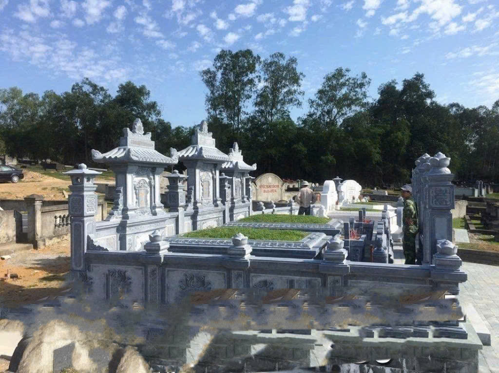 Màu xám trắng giúp tổng thể khu lăng mộ trở nên sáng sủa, thanh thoát, phù hợp với cảnh quan và yếu tố phong thủy tại Yên Khánh, Ninh Bình. Công trình thích hợp cho các khu lăng mộ gia đình mong muốn sự đơn giản, bền vững nhưng vẫn giữ được nét trang trọng cần thiết.