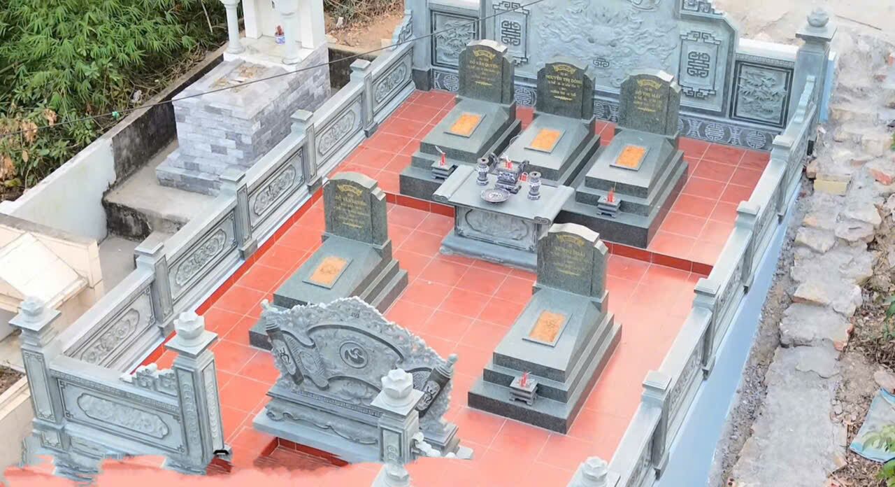 Màu xám trắng nguyên khối giúp công trình giữ được vẻ sáng sủa, trang nhã, phù hợp với không gian tưởng niệm tại Thanh Hà, Hải Dương. Khu lăng mộ đáp ứng tốt cả yêu cầu về thẩm mỹ, phong thủy và độ bền theo thời gian.