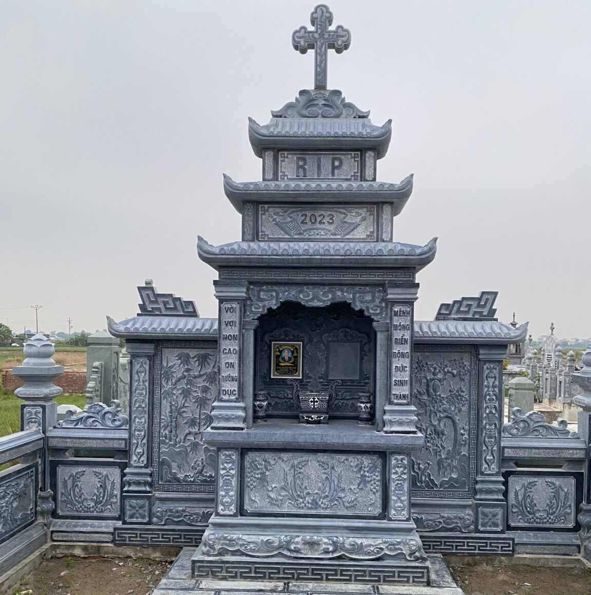 Sản phẩm được chạm khắc hoa văn đặc trưng của đạo Thiên Chúa là Cây Thánh giá, R.I.P, hoạ tiết hoa lá tây; đan xen với đó là năm hoàn thành và câu đối cân xứng ở hai bên. Đây là mẫu sản phẩm phù hợp để thi công tại khu vực có địa hình đất ẩm đồng ruộng, không gian thoáng, không vật cản và diện tích đất rộng rãi.