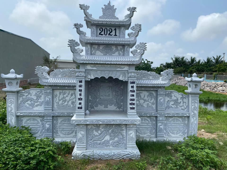 Chất liệu đá trắng xám không chỉ bền bỉ với thời tiết mà còn dễ vệ sinh, giữ được vẻ sáng mới theo thời gian. Công trình phù hợp với những gia đình mong muốn xây dựng khu lăng mộ tổ tiên sang trọng, thanh lịch và chuẩn phong thủy.