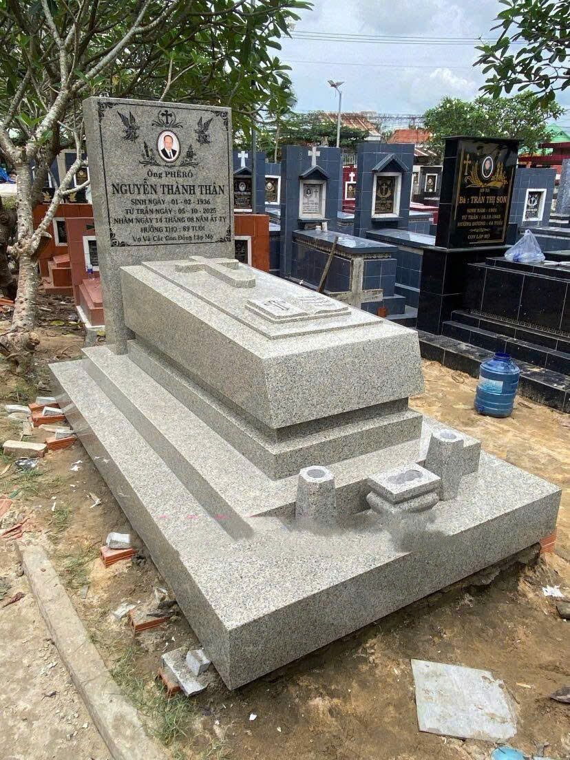 Mẫu mộ đá Công giáo CT113 được thiết kế theo dạng mộ đơn tam cấp vuông vắn, bề thế và vững chắc. Toàn bộ phần mộ sử dụng đá hoa cương trắng xám tự nhiên, bề mặt mài nhẵn mịn, hạn chế bám bẩn, chống thấm tốt, bền đẹp lâu dài theo thời gian. Các đường nét được gia công gọn gàng, sắc nét, tạo tổng thể trang nghiêm và trang trọng.