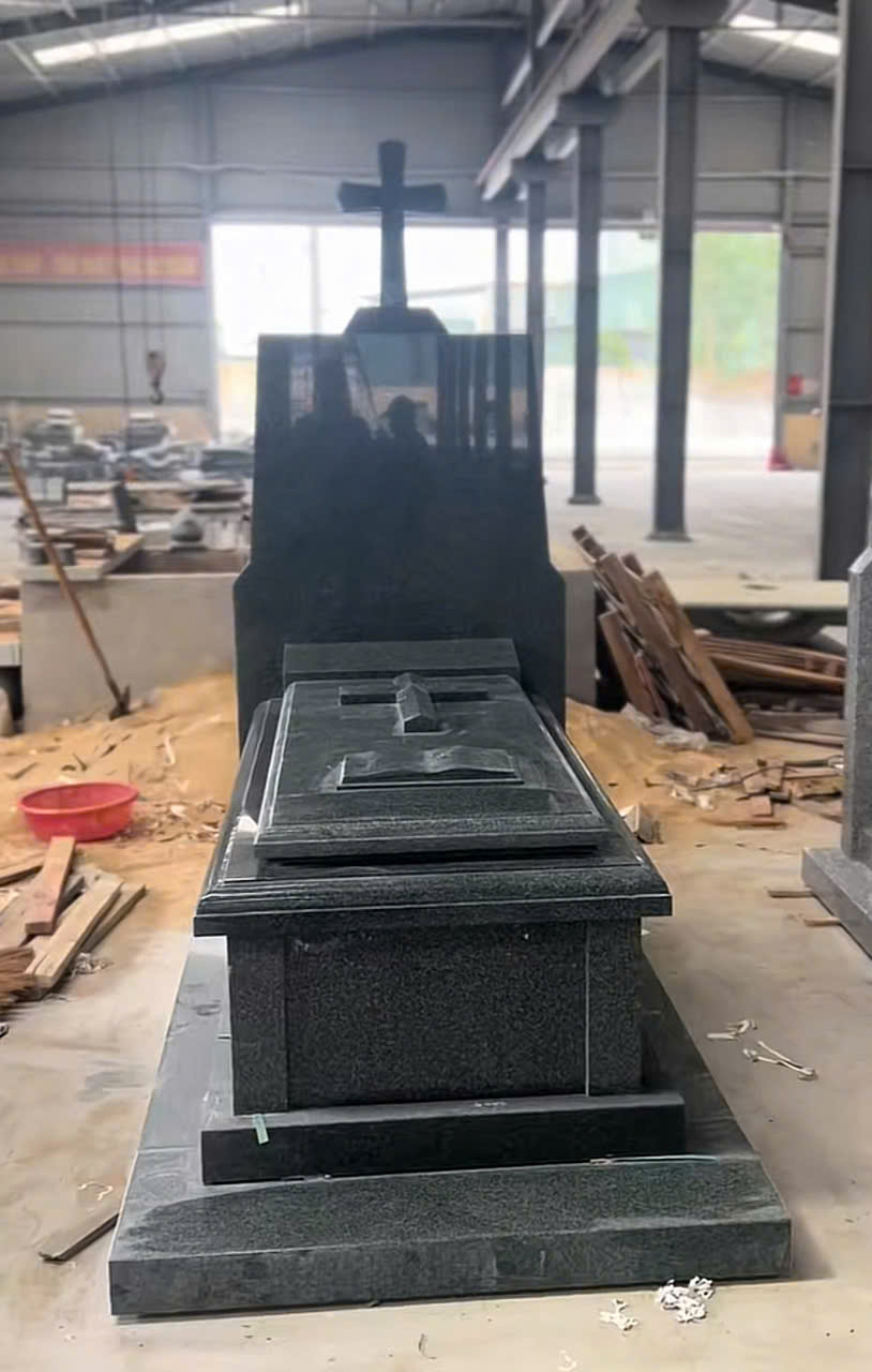 Thiết kế mộ mang hình khối gọn gàng, cân đối, bề mặt đá đen trơn mài nhẵn – mài bóng kỹ lưỡng, hạn chế hoa văn trang trí, giúp tôn lên vẻ đẹp mộc mạc nhưng sang trọng. Điểm nhấn chính là biểu tượng Thánh giá được khắc tinh tế hoặc tạo hình nổi trên thân mộ, thể hiện rõ niềm tin Công giáo và ý nghĩa về sự sống vĩnh hằng.