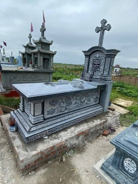 Lăng mộ đá công giáo xanh đen có thiết kế vững chắc, cân đối, phù hợp với kiến trúc truyền thống của các công trình Công giáo. Màu xanh đen trầm tạo cảm giác trang nghiêm, bền vững theo thời gian, đồng thời giúp làm nổi bật các chi tiết chạm khắc tinh tế như Thánh giá, Kinh Thánh hay hoa văn dây nho – biểu trưng cho đức tin và sự an lành.