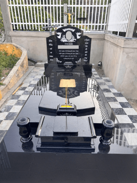 Lăng mộ đá hoa cương Công giáo được chế tác từ đá granite nguyên khối cao cấp, nổi bật với bề mặt mài bóng sang trọng, đường nét sắc sảo và độ bền vượt trội. Thiết kế mang đậm kiến trúc Thiên Chúa giáo, thể hiện qua bia mộ khắc Thánh giá, họa tiết Kinh Thánh và các hoa văn tinh tế bao quanh. Sự kết hợp giữa gam màu đen huyền của đá hoa cương và biểu tượng tôn giáo tạo nên tổng thể trang nghiêm, thanh lịch và trang trọng.