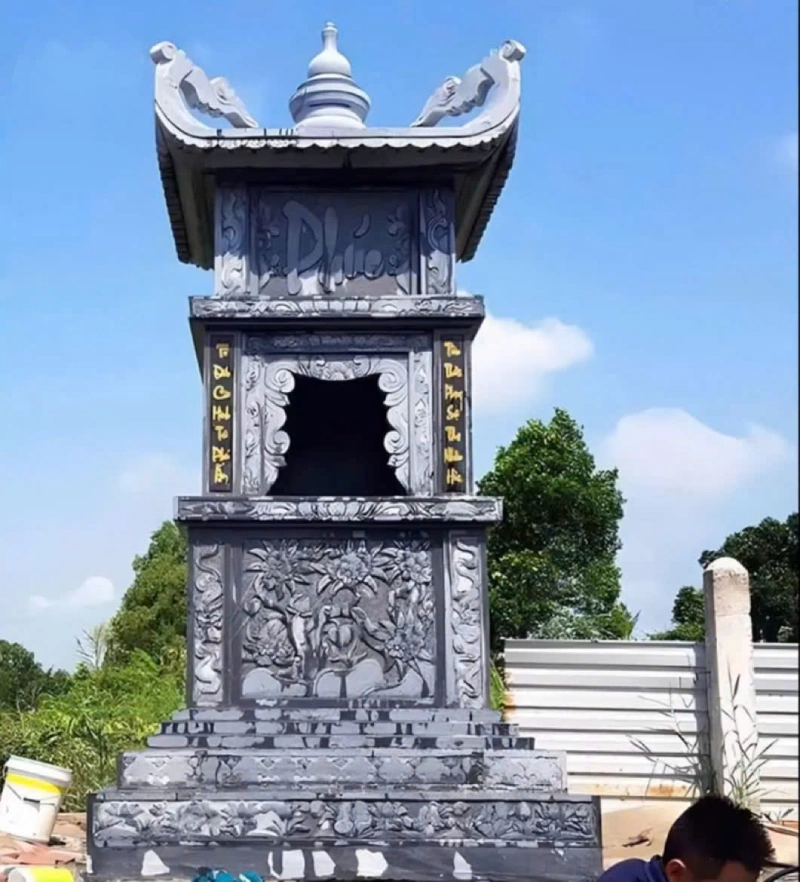 Mộ đá tháp 3 tầng xanh đen đậm mái đình MT05