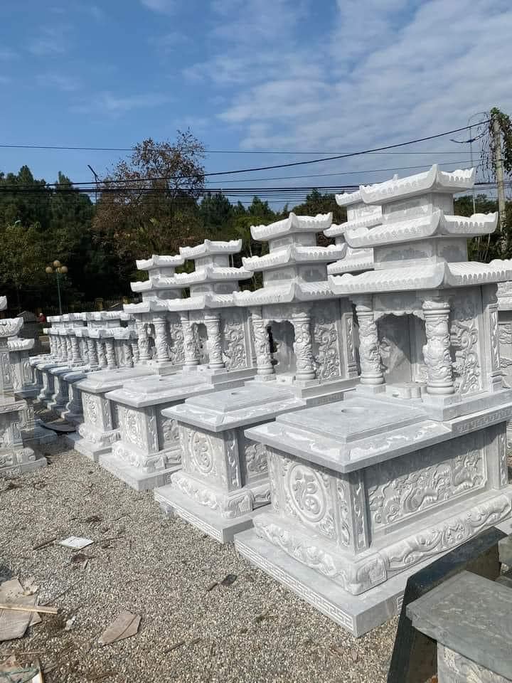 Mộ đá trắng 3 mái là dòng sản phẩm cao cấp được chế tác từ đá trắng tự nhiên nguyên khối, nổi bật với thiết kế ba tầng mái uy nghi và cân đối. Phần mái được chạm khắc hoa văn tinh xảo như hoa sen, vân mây, tứ linh – biểu tượng cho sự thanh cao, bền vững và linh thiêng trong không gian tâm linh.