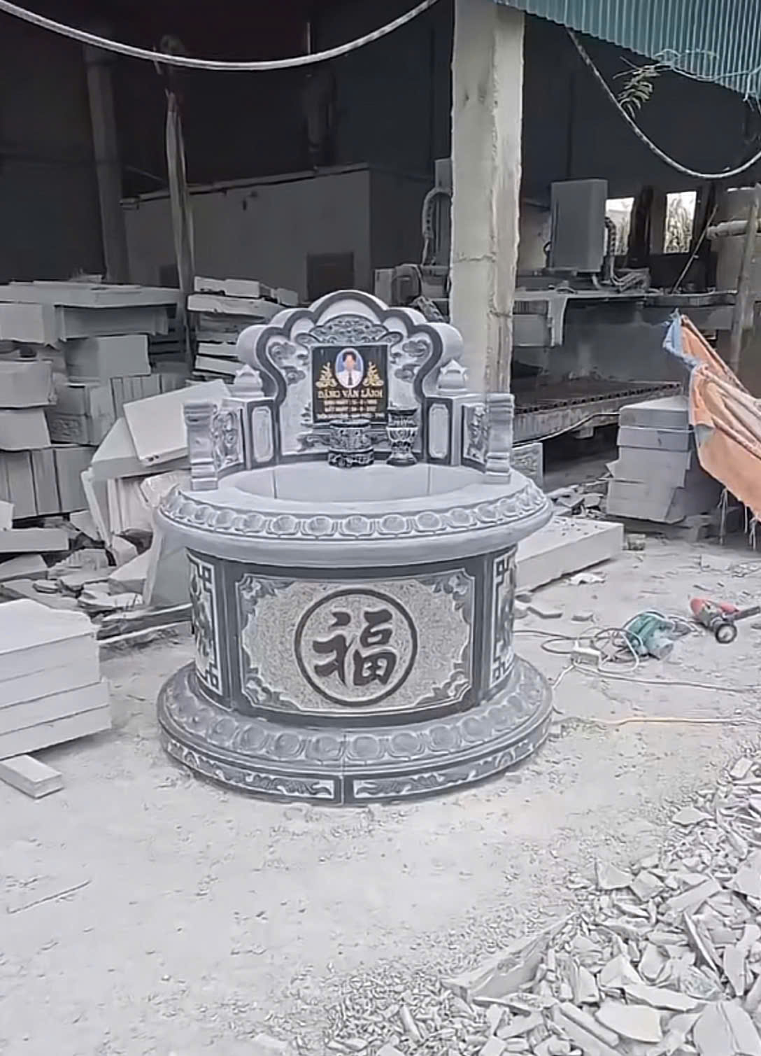 Mộ đá tròn cao cấp CT81 tại Tam Điệp – Ninh Bình có thiết kế dáng tròn bề thế, bo cong mềm mại, không góc cạnh, thể hiện sự viên mãn và trường tồn theo quan niệm phong thủy phương Đông. Thân mộ chạm khắc chữ Phúc cùng hoa văn truyền thống, đường nét tinh xảo, cân đối, mang vẻ trang nghiêm và sang trọng.
