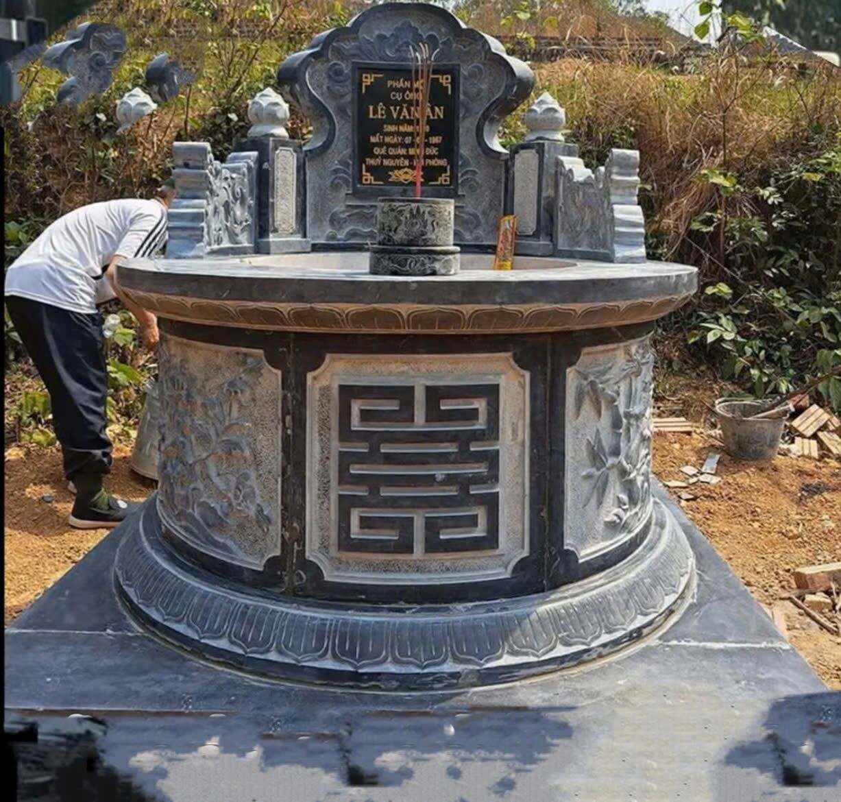 Mộ đá tròn CT85 tại Thủy Nguyên – Hải Phòng có thiết kế dáng tròn bề thế, các đường bo cong mềm mại, không góc cạnh, thể hiện sự viên mãn và trường tồn theo quan niệm phong thủy phương Đông. Thân mộ chạm khắc hoa văn truyền thống tinh xảo, đường nét rõ ràng, cân đối, tạo vẻ trang nghiêm cho công trình mộ phần.