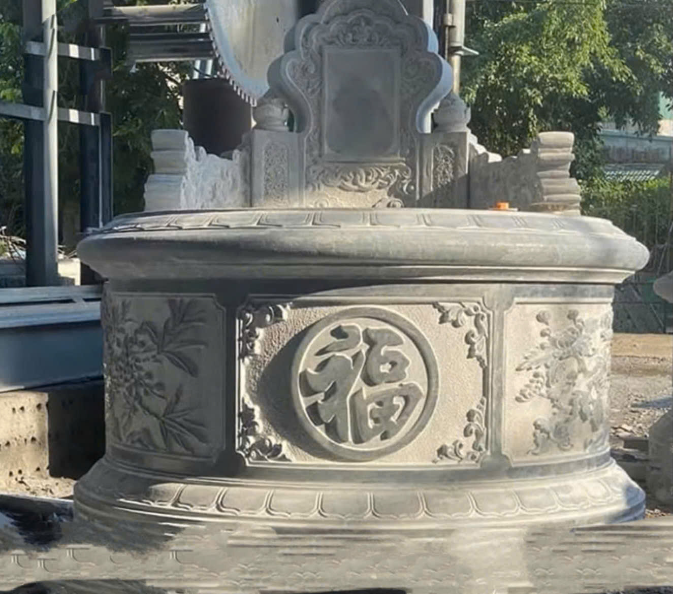 Mộ đá tròn CT92 tại Bắc Sơn – Lạng Sơn có thiết kế dáng tròn bề thế, bo cong mềm mại, không góc cạnh, thể hiện sự viên mãn và trường tồn theo quan niệm phong thủy phương Đông. Thân mộ chạm khắc hoa văn truyền thống tinh xảo, đường nét rõ ràng, cân đối, mang vẻ trang nghiêm cho công trình mộ phần.