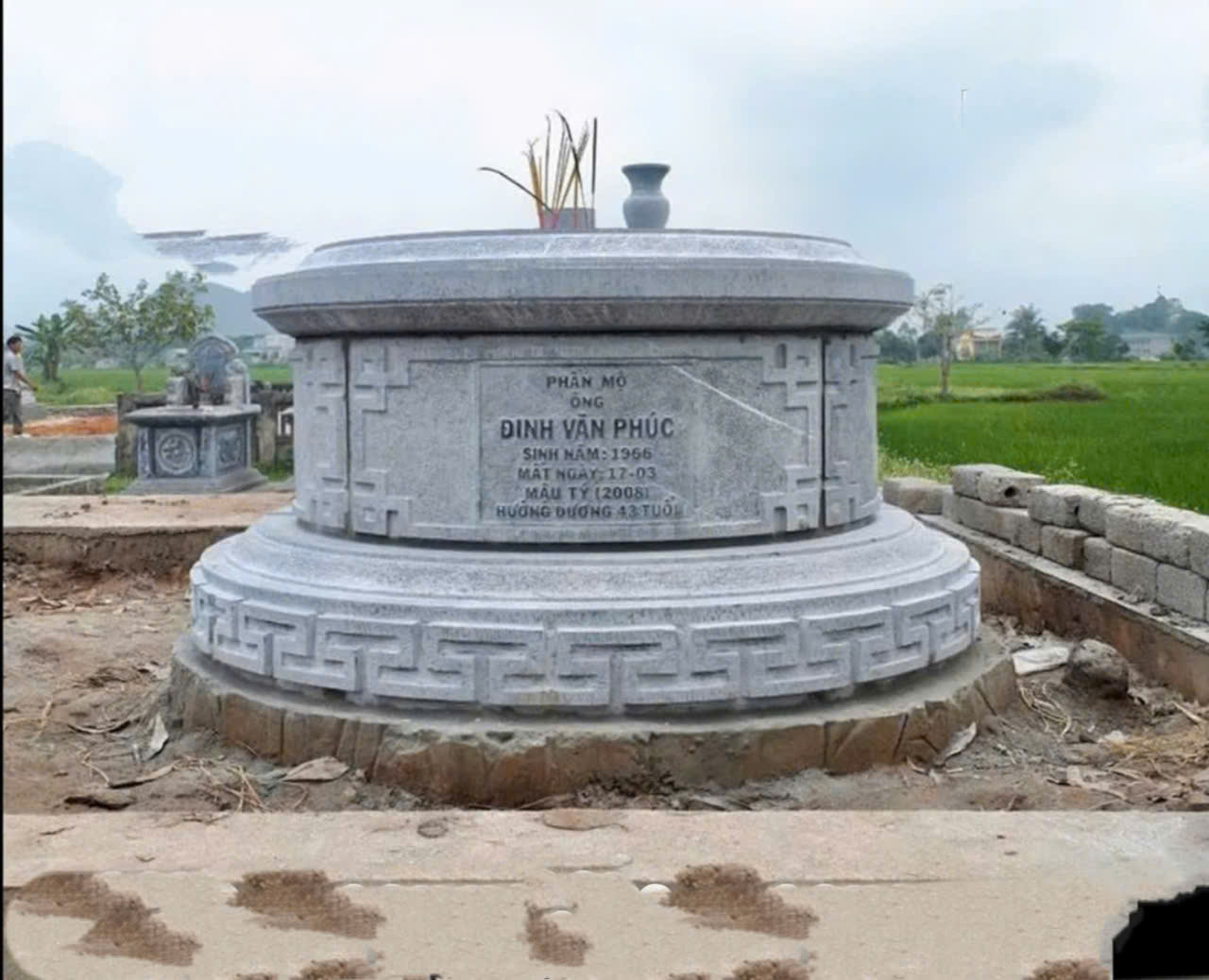 Mộ đá tròn CT94 tại Nam Sách – Hải Dương có thiết kế dáng tròn bề thế, bo cong mềm mại, không góc cạnh, thể hiện sự viên mãn và trường tồn theo quan niệm phong thủy phương Đông. Thân mộ chạm khắc hoa văn truyền thống tinh xảo, đường nét rõ ràng, cân đối, mang vẻ trang nghiêm cho công trình mộ phần.
