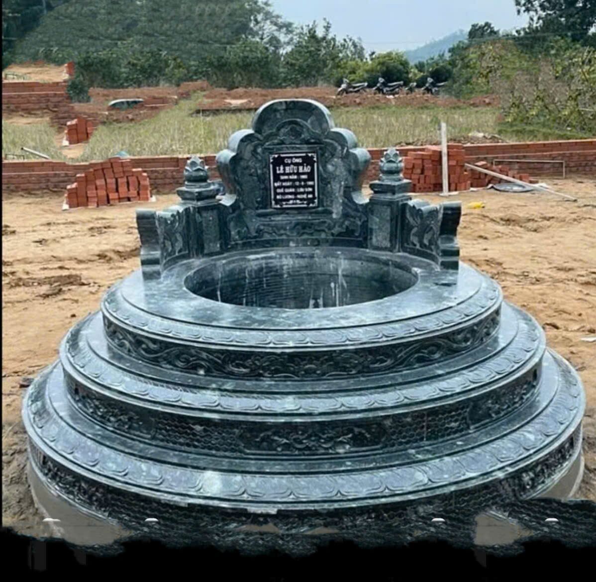 Mộ đá tròn xanh đen cao cấp CT83 tại Lục Nam – Bắc Giang có thiết kế dáng tròn nhiều cấp bề thế, các đường bo cong mềm mại, không góc cạnh, thể hiện sự viên mãn và trường tồn theo quan niệm phong thủy phương Đông. Phần thân mộ và bậc cấp được chạm khắc hoa văn truyền thống tinh xảo, tạo vẻ trang nghiêm và uy nghi cho công trình mộ phần.