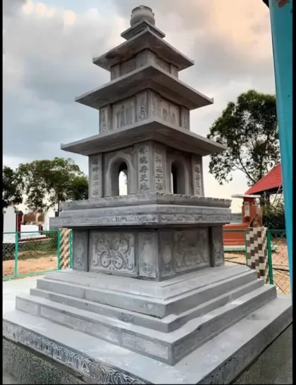 Mộ tháp đá 3 tầng đơn giản đẹp là dòng sản phẩm mộ đá cao cấp được nhiều gia đình lựa chọn hiện nay nhờ thiết kế trang nghiêm, bền vững và mang đậm giá trị tâm linh truyền thống. Công trình được chế tác từ đá tự nhiên nguyên khối, có độ cứng cao, khả năng chống chịu nắng mưa tốt, không rêu mốc hay xuống cấp theo thời gian. Kiểu dáng tháp 3 tầng cân đối, tối giản nhưng vẫn toát lên vẻ uy nghiêm, phù hợp với nhiều không gian như khu lăng mộ gia đình, nghĩa trang, chùa chiền hay nơi thờ tự riêng biệt.
